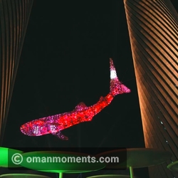 The aluminum and steel whale shark sculpture, which is suspended 20 meters above Lusail Plaza between the four Lusail Towers designed by Norman Foster's architectural firm Foster + Partners, comes to life with lights and a custom score by renowned musician Roberto Cacciapaglia.