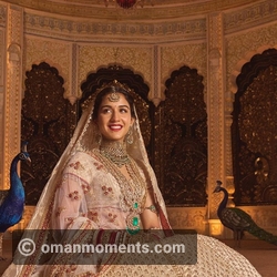 The wedding outfit is complemented by magnificent jewellery, which uplifts this traditional bridal look.