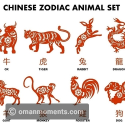 Chinese zodiac, or shengxiao (/shnng-sshyao/ 'born resembling'), unlike the general zodiac, is represented by 12 zodiac animals. In order, they are the Rat, Ox, Tiger, Rabbit, Dragon, Snake, Horse, Goat, Monkey, Rooster, Dog, and Pig.