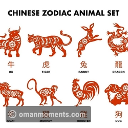 Chinese zodiac, or shengxiao (/shnng-sshyao/ 'born resembling'), unlike the general zodiac, is represented by 12 zodiac animals. In order, they are the Rat, Ox, Tiger, Rabbit, Dragon, Snake, Horse, Goat, Monkey, Rooster, Dog, and Pig.