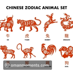 Chinese zodiac, or shengxiao (/shnng-sshyao/ 'born resembling'), unlike the general zodiac, is represented by 12 zodiac animals. In order, they are the Rat, Ox, Tiger, Rabbit, Dragon, Snake, Horse, Goat, Monkey, Rooster, Dog, and Pig.