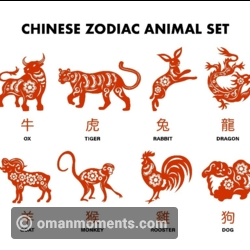 Chinese zodiac, or shengxiao (/shnng-sshyao/ 'born resembling'), unlike the general zodiac, is represented by 12 zodiac animals. In order, they are the Rat, Ox, Tiger, Rabbit, Dragon, Snake, Horse, Goat, Monkey, Rooster, Dog, and Pig.