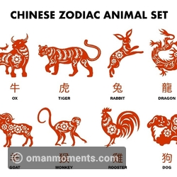 Chinese zodiac, or shengxiao (/shnng-sshyao/ 'born resembling'), is represented by 12 zodiac animals. In order, they are the Rat, Ox, Tiger, Rabbit, Dragon, Snake, Horse, Goat, Monkey, Rooster, Dog, and Pig.