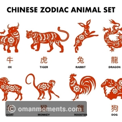 Chinese zodiac, or shengxiao (/shnng-sshyao/ 'born resembling'), unlike the general zodiac, is represented by 12 zodiac animals. In order, they are the Rat, Ox, Tiger, Rabbit, Dragon, Snake, Horse, Goat, Monkey, Rooster, Dog, and Pig.