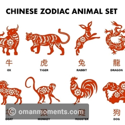 Chinese zodiac, or shengxiao (/shnng-sshyao/ 'born resembling'), is represented by 12 zodiac animals. In order, they are the Rat, Ox, Tiger, Rabbit, Dragon, Snake, Horse, Goat, Monkey, Rooster, Dog, and Pig.
