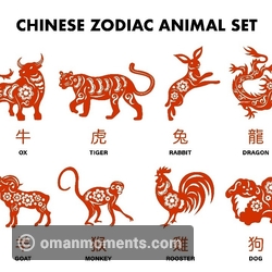 Chinese zodiac, or shengxiao (/shnng-sshyao/ 'born resembling'), is represented by 12 zodiac animals. In order, they are the Rat, Ox, Tiger, Rabbit, Dragon, Snake, Horse, Goat, Monkey, Rooster, Dog, and Pig.