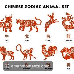 Chinese zodiac, or shengxiao (/shnng-sshyao/ 'born resembling'), unlike the general zodiac, is represented by 12 zodiac animals. In order, they are the Rat, Ox, Tiger, Rabbit, Dragon, Snake, Horse, Goat, Monkey, Rooster, Dog, and Pig.