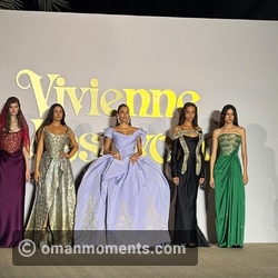 Contrasting these opulent evening looks were sharply tailored suits in pinstripe, plaid, and solid tones, crafted from wool and cotton blends. Structured double-breasted jackets, crisp shirts with high collars, and oversized lapels brought a touch of British precision to the Saudi runway. Accessories, including chandelier earrings, metallic handbags, and pointed heels, complemented the avant-garde spirit of the collection, while veils, belts, and embroidered details reinforced Vivienne Westwood’s masterful approach to craftsmanship.